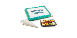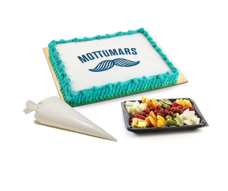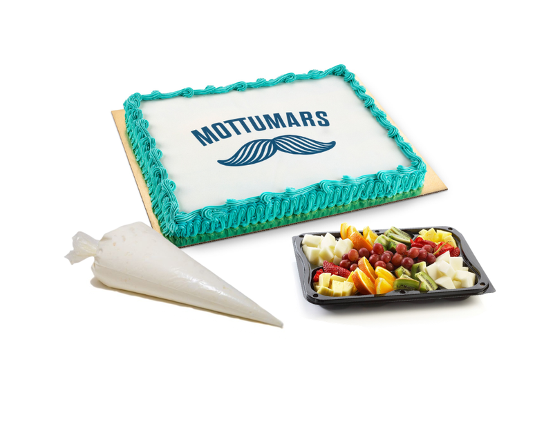 25 manna skúffukökufleki með bláu smjörkremi og mynd, ávaxtabakki og þeyttur rjómi. 15% af söluvirði rennur til átaksins.